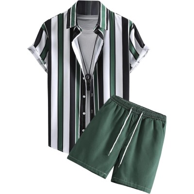 Men's 2 Piece Outfits Tropical Print Striped Short Sleeve Button Down Hawaiian Shirt and Shorts Sets