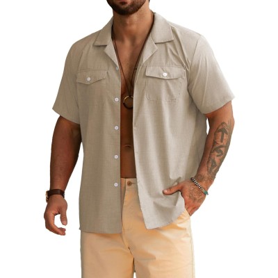 Men's Cuban Collar Shirts Camp Button Down Shirt with Pockets Short Sleeve with Pockets